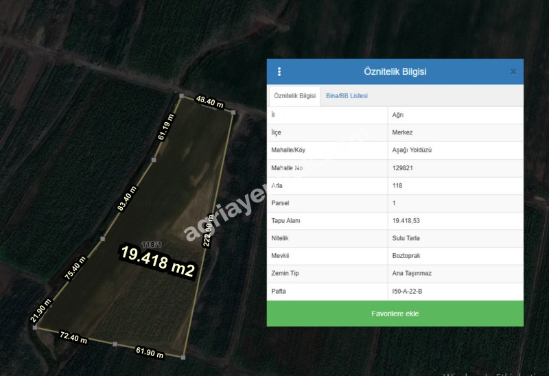 AĞRI / MERKEZ / AŞAĞIYOLDÜZÜ KÖYÜ Satılık Tarla3.100.000